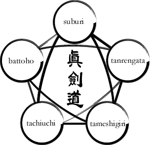 Au Shinkendo, ces cinq aspects de l'escrime japonaise (Suburi, Battoho, Tanrengata, Tachiuchi, et Tameshigiri) sont comme cinq anneaux entrelacés. Chaque anneau a un rapport direct avec les autres. C'est la base d'une étude approfondie de l'escrime japonaise. Cela permet d’avoir une vue d’ensemble des techniques afin de poursuivre leur étude en profondeur.